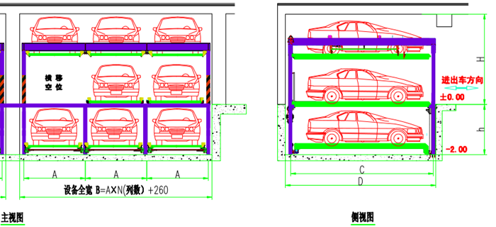 带基坑三层升降横移 运行原理 该设备的顶层载车板可上下升降;基坑层载车板可上下升降;地面层载车板做横移,地面层留有一个空位,可以通过横移载车板变换空位,使空位正上或下方的载车板下降或上升到地面层。地