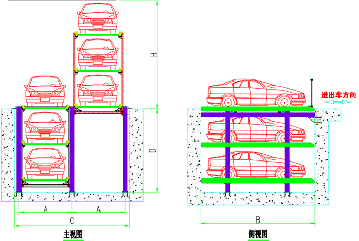 基坑三层升降 运行原理 该设备每组上中下三个车台板为一体,同时做升降运动。机械下降到最低的时候,上层车台板正好与地面平,此时上层车位可以进出车辆。机械上升到中层车台板与地面平时,机械停止,此时中层车位