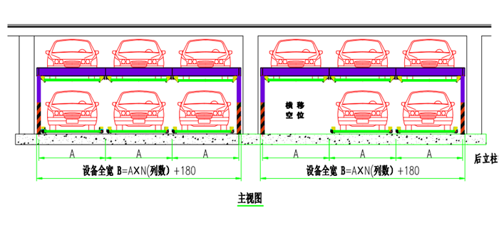 二层升降横移 运行原理 该设备的顶层载车板可上下升降;地面层载车板做横移,地面层留有一个空位,可以通过横移载车板变换空位,使空位正上方的载车板下降到地面层。地面层载车板上的汽车可直接出车,完成存取过程
